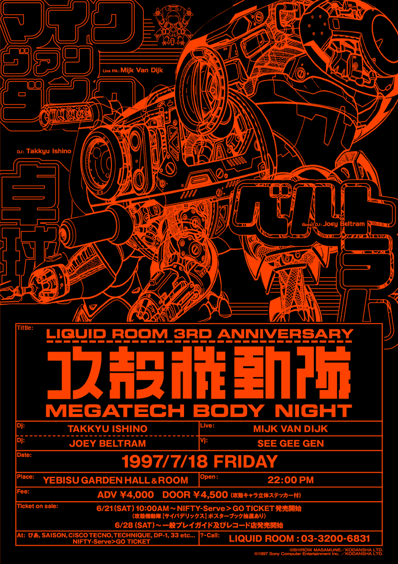 I pulled this design from a promotional poster made for the launch party of the Ghost in the Shell video game (PS1, 1997). I found the soundtrack for the game first, got obsessed with it, and in turn became obsessed with the album art and eventually found the poster